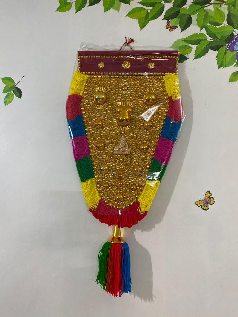 This is completely handmade. Gold coated fiber beads of multiple size and shapes are carefully crafted in the inner surface. Multi-color woolen threads in the outer periphery are manually tide using equal lengths adds additional beauty of the item. Velvet inner base and aluminum upper holding bar is used to bring more strength while hanging on the wall. This is made with high quality raw materials which guarantee everlasting, durable and foldable status.